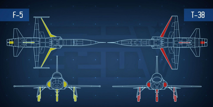 人人看T-38和F-5的造型,就能一眼看出它们的亲缘干系,天然细节上也有远离,比如机翼边际、进气口形状、尾部延缓伞舱、起落架和尾钩等。