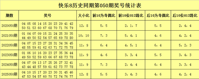 大小比分析:在积年第050期同时开奖中,奖号大小总比例为67:53,大号走势相对较热,昨年同时号码大小比为12:8,小 号走势相对较冷,本年第050期同时把稳小 号回补转热,参考大小比7:13。