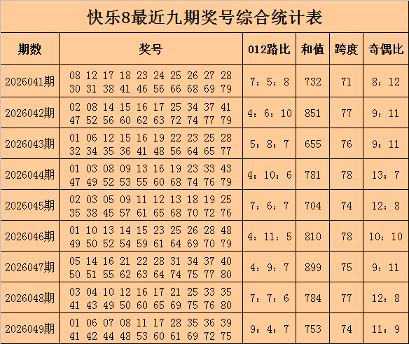 福彩感奋8第2026049期开奖追念奖号:01 06 07 08 11 17 28 35 36 39 41 42 44 48 53 60 61 69 72 75,其中奖号奇偶比为11:9,012路比为9:4:7,和值为753,跨度为74。