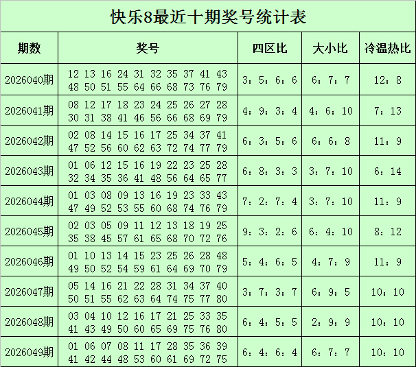 福彩快乐8第2026049期开奖精采:01 06 07 08 11 17 28 35 36 39 41 42 44 48 53 60 61 69 72 75,其中奖号四区比为6:4:6:4,冷温热码比为6:7:7,大小比为10:10,和值为753,同尾号码为01 11 41 61、42 72、35 75、06 36、07 17、08 28 48、39 69。
