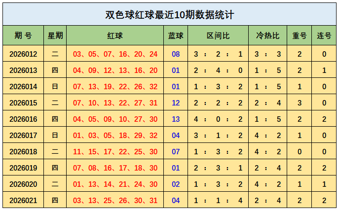 上期总结:双色球第2026021期开出奖号:红球03、13、25、26、30、31;蓝球04,其中红球三区比为1:1:4,开出2枚重号13、30,开出2组连号25、26和30、31,蓝球开出一区号码04。