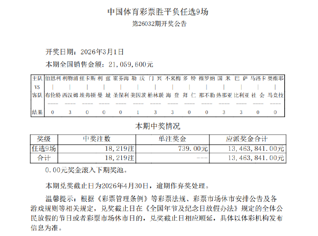 北京时代3月1日,赢输彩第26032期开奖遵守揭晓。本期任选九场开出18,219注,单注奖金739元。本期任九投注总数为21,059,600元。