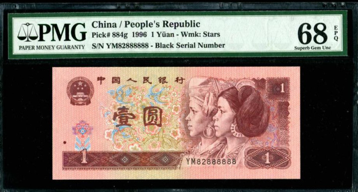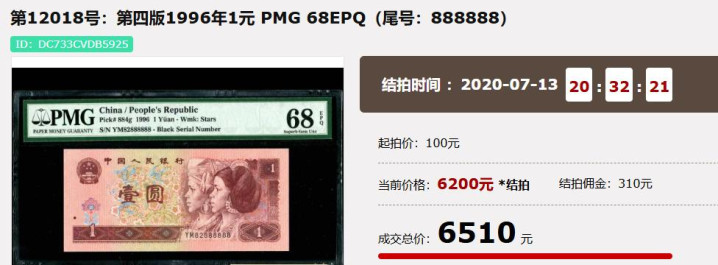 宇宙看,这是一张前几年拍卖会上拍出的1996年的1元纸币,它的成交总价是6510元,长短常有保藏价值的一张纸币。原因就在它的冠号以及品相上。这张纸币的冠号是背面6位数字交流的大象号纸币,况兼一经数字8的大象号。再加上68分的评级,让这张纸币的身价暴涨。