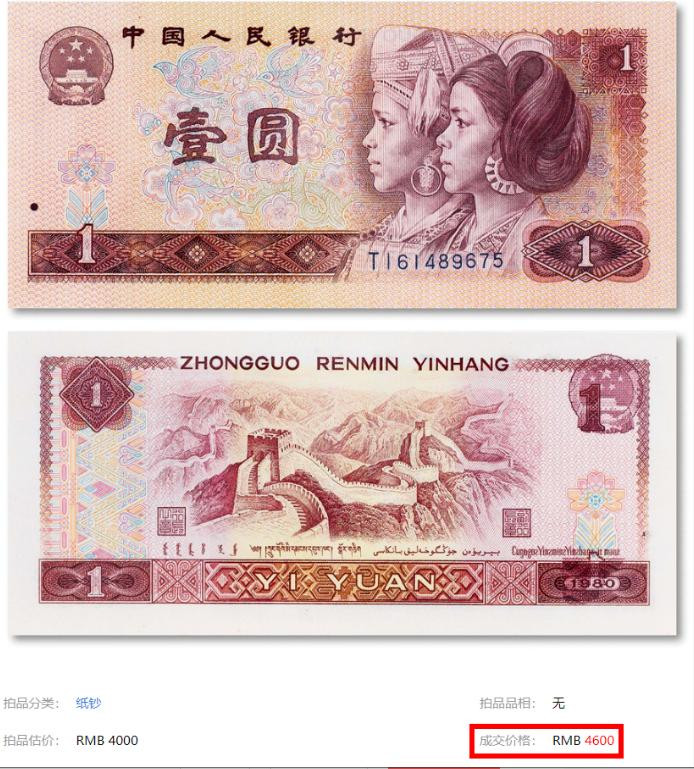再看另外一张1980年的1元纸币,在拍卖会上卖出了4600元的价钱。比拟它正本的面值,涨幅不错说是突出的惊东谈主。这张纸币的分辩在它的背面。