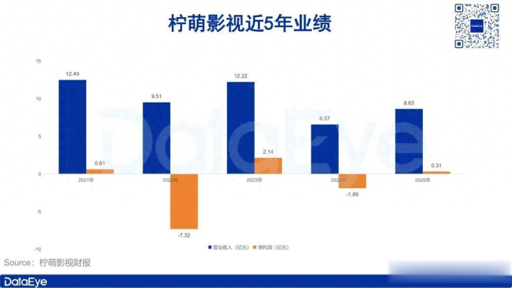 近日,柠萌影视发布2025年年度陈说,近5年,柠萌影视事迹呈轰动趋势:总营收由2021年的12.49亿元下滑至2025年的8.63亿元,净利润过程大跌后扭亏为盈。