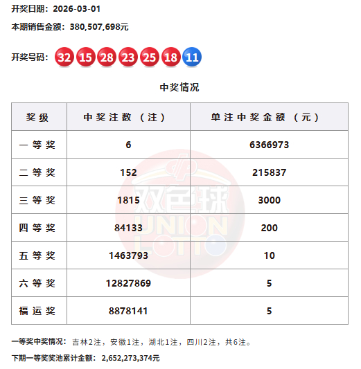 北京时刻2026年3月1日,福彩双色球第26022期开奖,当期开奖号码为15 18 23 25 28 32 + 11。本期一等奖开出6注,单注奖金636万元。本期二等奖开152注,单注奖金21.5万,此外,因开奖前奖池高于15亿,增设5元福运奖(掷中3枚红球即中奖),共开出8878141注。本期双色球销量为3.8亿余元,奖池余额26.5亿余元。