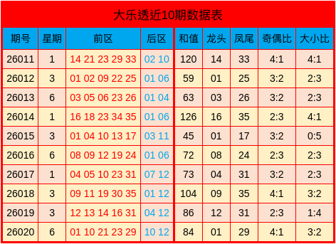 上期总结:大乐透第2026020期开奖:前区01、10、21、23、29;后区10、12。