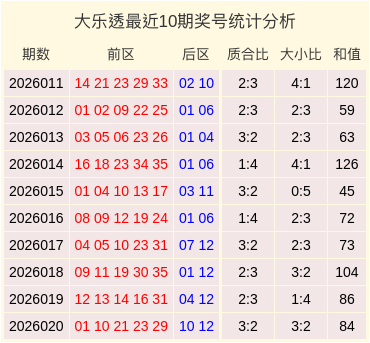 大乐透2026020期开奖,本期奖号:前区01、10、21、23、29,后区10、12。其中前区奖号质合比为3:2,大小比为3:2,和值为84。