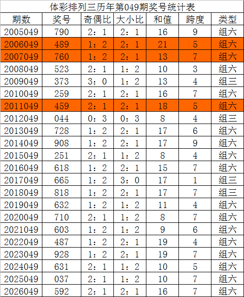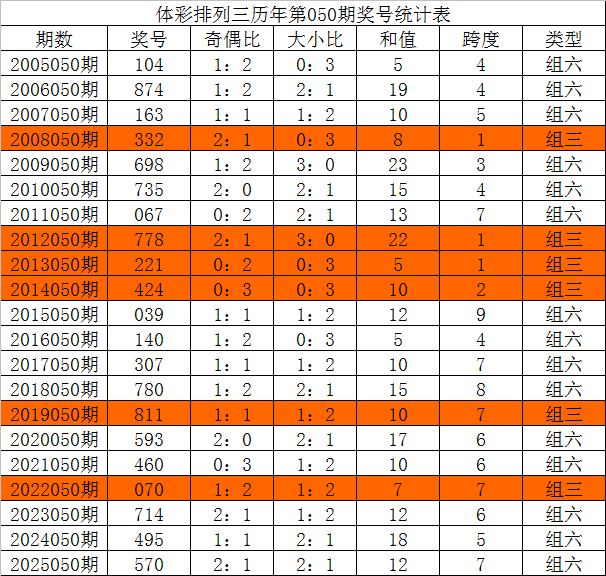 在积年景列三第050期开奖中:组三号码出现6次,组六号码出现15次。组六号码出现比例略高,本期奖号情状参考:组六号码。
