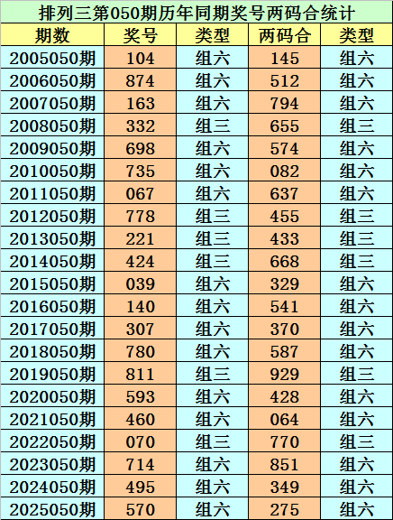 陈列三从2004年开奖于今已开出7524期奖号了,其中第050期历史同时奖号出现21次,积年第050期离别开出号码:104、874、163、332、698、735、067、778、221、424、039、140、307、780、811、593、460、070、714、495、570。