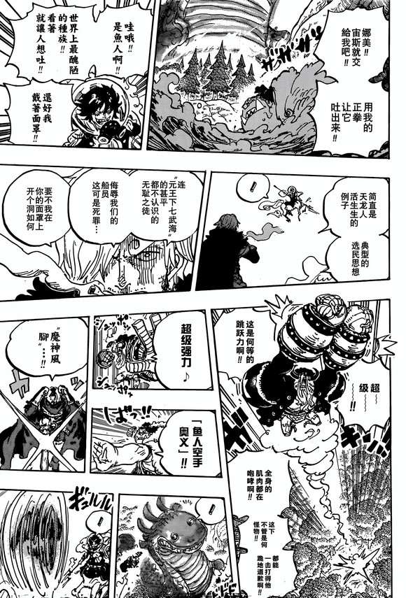 靠近侮辱我方伙伴的麒麟圣,凉帽海贼团全力入手。其中弗兰奇超等右拳径直打爆蛇龙的脑袋,甚平打爆他的体格。至于山治则是踢爆了麒麟圣的玻璃罩,展现了雄壮的战力!