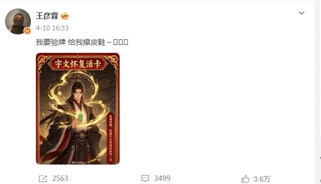 次日他趁势推出“宇文怀回生卡”,标注“可使脚色回生一次”,并配文“过去骂我和如今夸我的是一波东谈主吧”,相关缠绵繁衍出“此次姆妈都备因循!快去看管新剧”等努力梗,单日互动量超百万。
